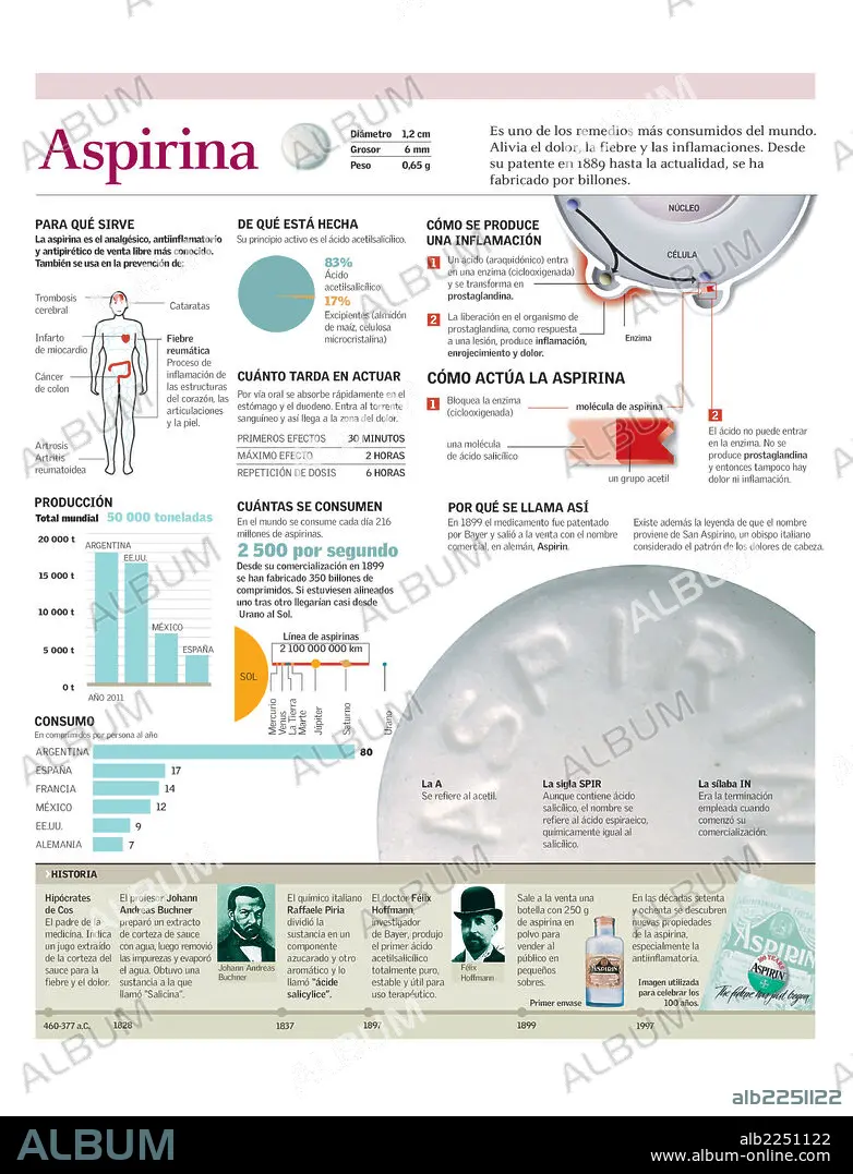 Infografía de la composición, principio activo, producción y consumo mundial de aspirina.