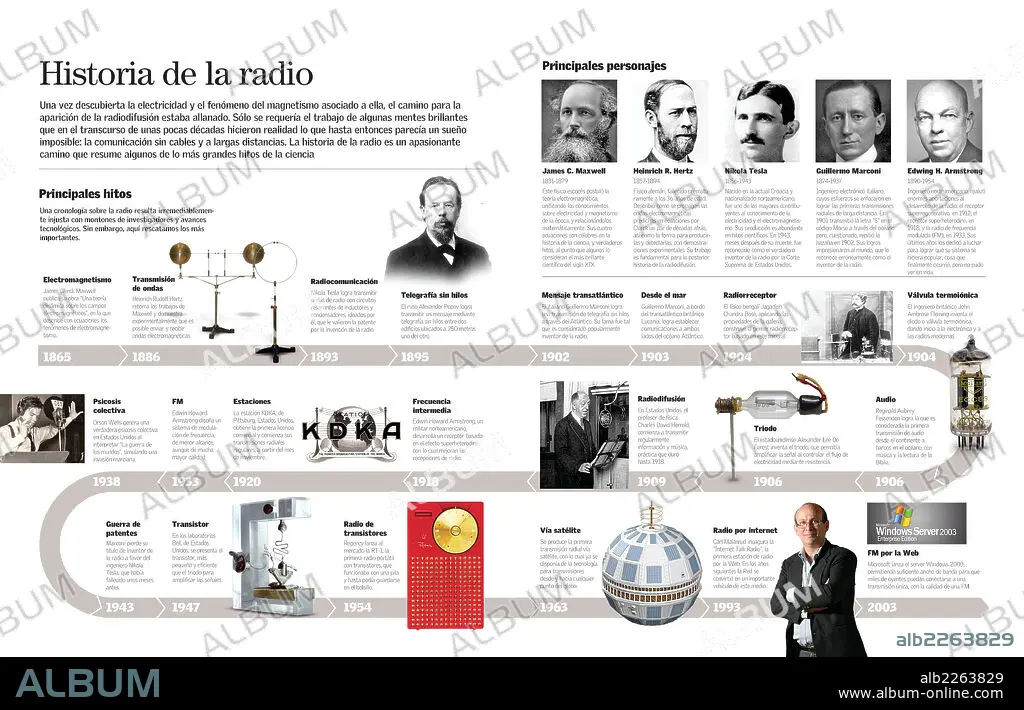 Infografía sobre el desarrollo histórico del aparato radiofónico a través de sus principales protagonistas.