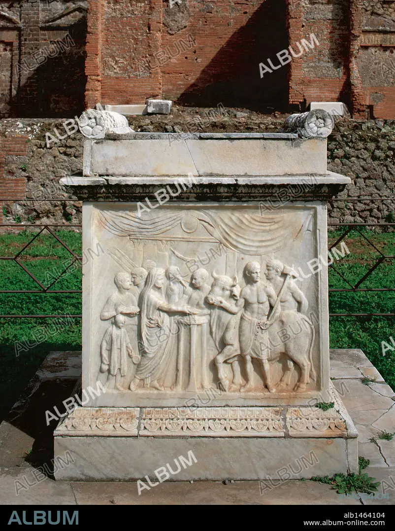ARTE ROMANO. ITALIA. ALTAR de mármol del TEMPLO DE VESPASIANO con un bajorrelieve de una de las caras del ara donde se representa el SACRIFICIO DE UN TORO DELANTE DEL TEMPLO. FORO. POMPEYA. La Campania.