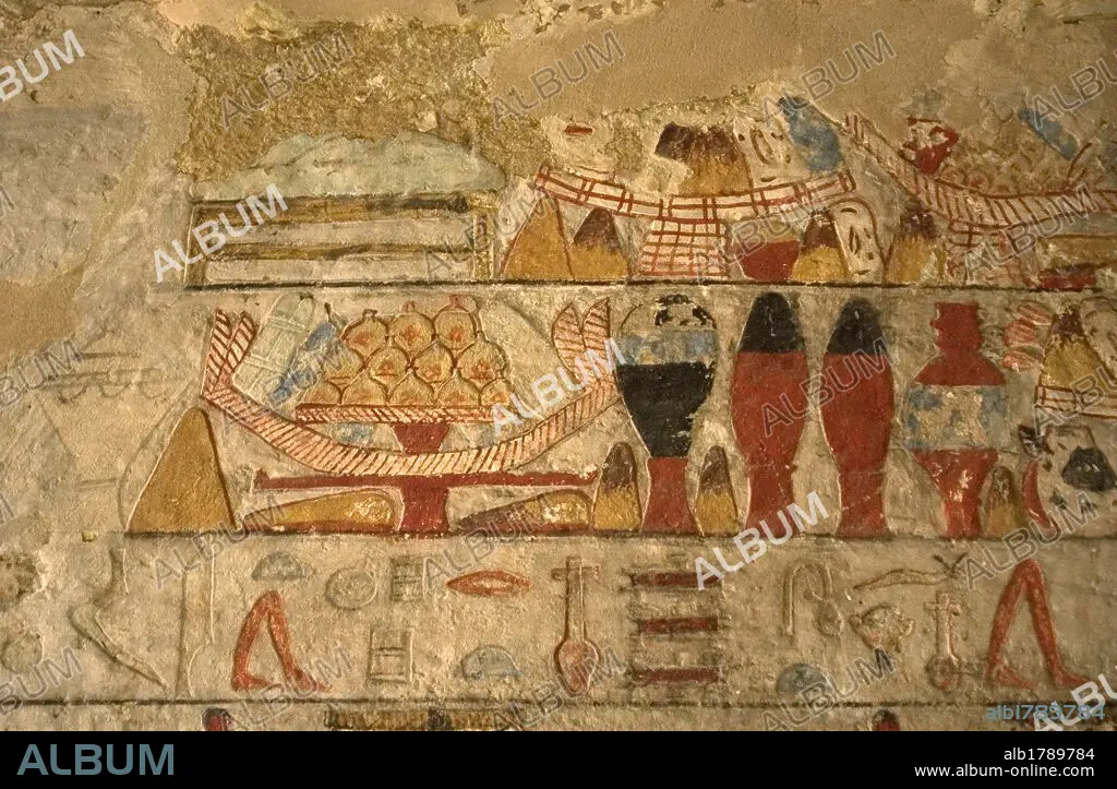 Descripción: ARTE EGIPCIO. EGIPTO. NECROPOLIS DE SAKKARA. Detalle de un relieve policromado de una MASTABA de la V DINASTIA del IMPERIO ANTIGUO. Representación de LA MESA DE OFRENDAS (ALIMENTOS), para la vida al más allá. Egipto.