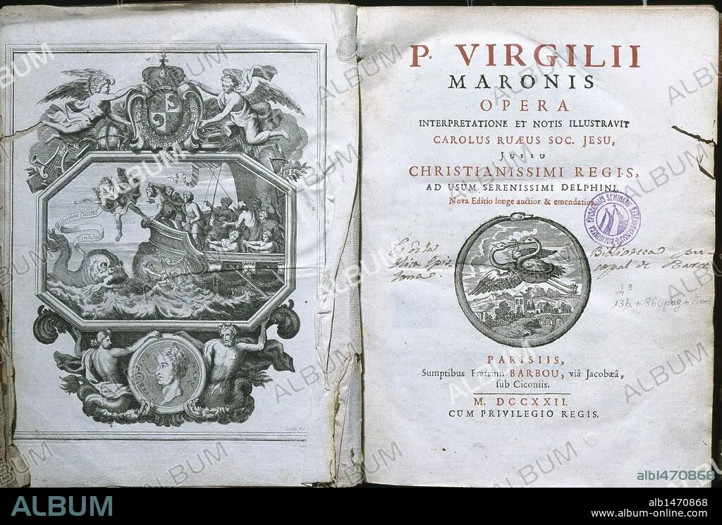 VIRGILIO MARON (Publio) (Publius Virgilius Maro) (70 a. C. -19 a. C.). Poeta latino. Frontispicio y portada de sus obras editadas en París, 1722.