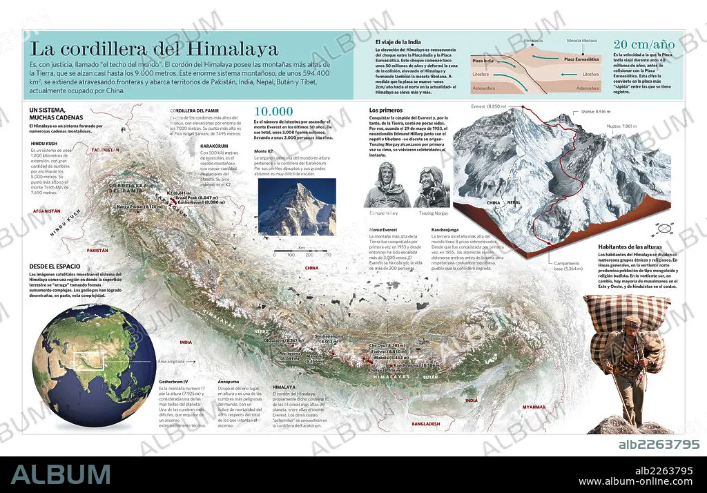 Infografía acerca del relieve, características y expediciones de la cordillera del Himalaya, en Asia.