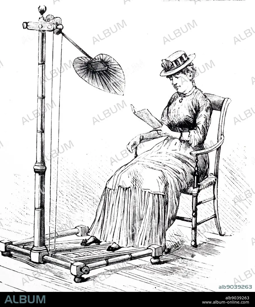An engraving depicting a woman using a pedal operated punkah type ventilator to keep herself cool. Dated 19th century