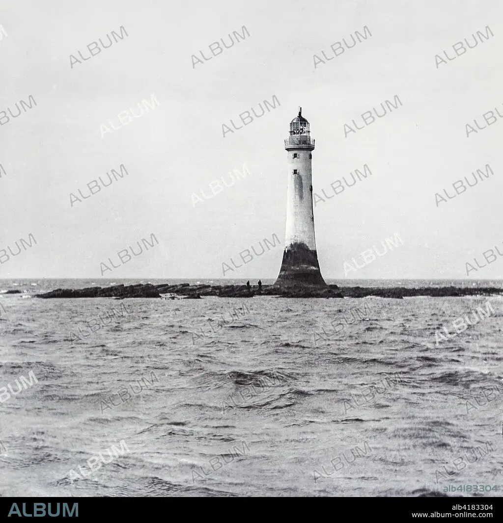Bell Rock Lighthouse, off the coast of Angus, Scotland, is the world's oldest surviving sea-washed lighthouse. Magic lantern slide circa 1900; Angus, Scotland