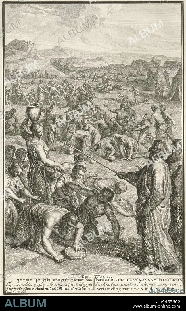 Gathering the manna, Joseph Mulder, after Gerard Hoet (I), 1720 - 1728, The Israelites gather the manna in pots and baskets. In the foreground right Moses, with his staff, and Aaron. Below in the margin a reference to the Bible text and title in Hebrew, English, German, Latin, French and Dutch., print maker: Joseph Mulder, (mentioned on object), intermediary draughtsman: Gerard Hoet (I), (mentioned on object), Amsterdam, 1720 - 1728, paper, engraving, etching, h 349 mm × w 218 mm