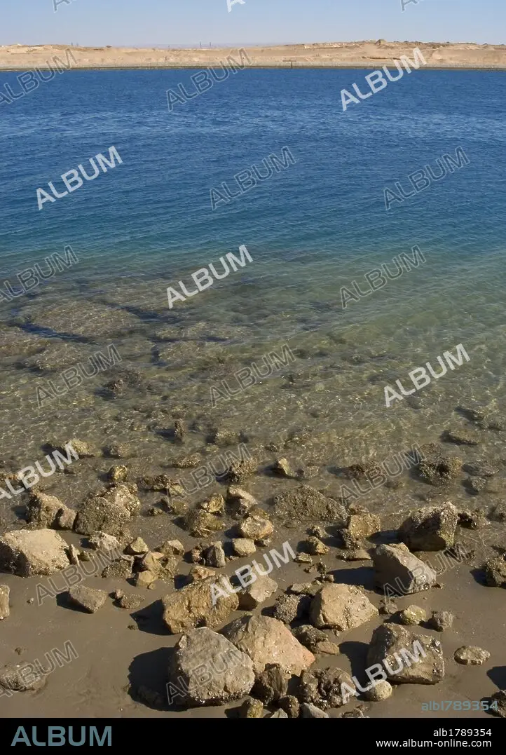 EGIPTO. Vista del CANAL DE SUEZ, vía de navegación artificial que une el mar Mediterráneo con el mar Rojo a través del Istmo de Suez. Su longitud es de 163 km. entre Puerto Said y Suez. Permitió acortar la ruta del comercio marítimo entre Europa y el sur de Asia. Construido entre 1859 y 1869 por Ferdinand de Lesseps (1805-1894) .