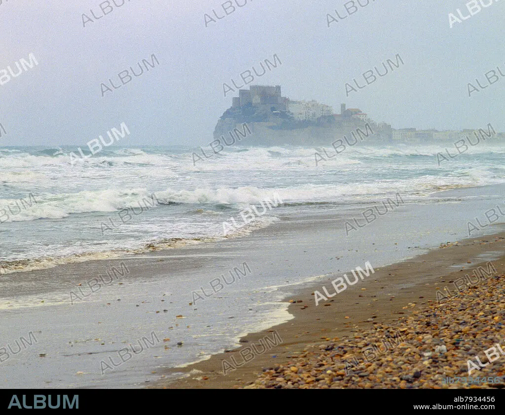 MAR EN TORMENTA CON EL CASTILLO DE PEÑISCOLA AL FONDO (FOTO SIMILAR CON BUEN TIEMPO Nº143908) - FOTO AÑOS 90 -.