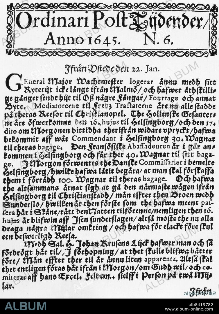1645. Nummer 6 av Postverkets nyhetsblad Ordinari Post Tijdender. Den började utges 1645 och. fortsattes på 1700-talet av Stockholms Post-Tidningar. Ordinari Post Tijdender var Sveriges första tidning, det var Axel Oxenstierna som grundade tidningen.. Scanpix / Kod: 194.