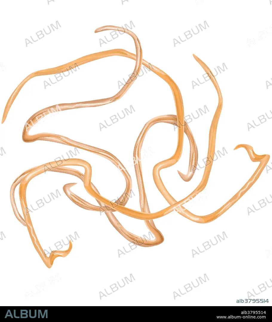 Illustration of adult onchocerca volvulus in subcutaneous nodule. The onchocerca volvulus worm causes river blindness, an eye and skin disease. The illness is spread by the bite of infected blackflies.