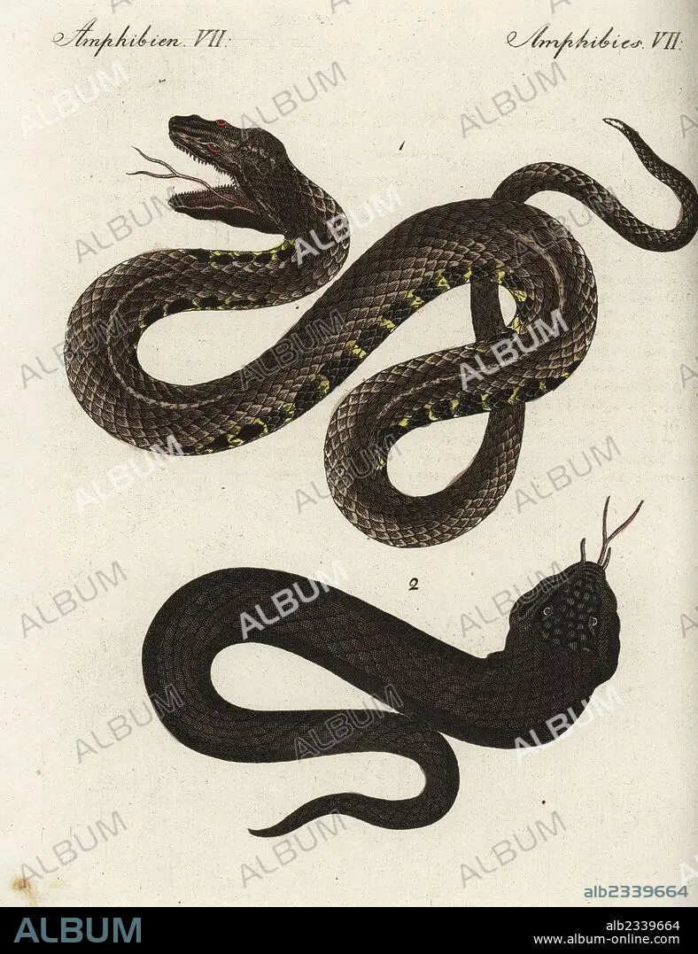 Sahara sand viper, Cerastes vipera 1, and black asp, Vipera aspis atra, vulnerable 2. Handcoloured copperplate engraving from Friedrich Johann Bertuch's Bilderbuch fur Kinder (Picture Book for Children), Weimar, 1795.