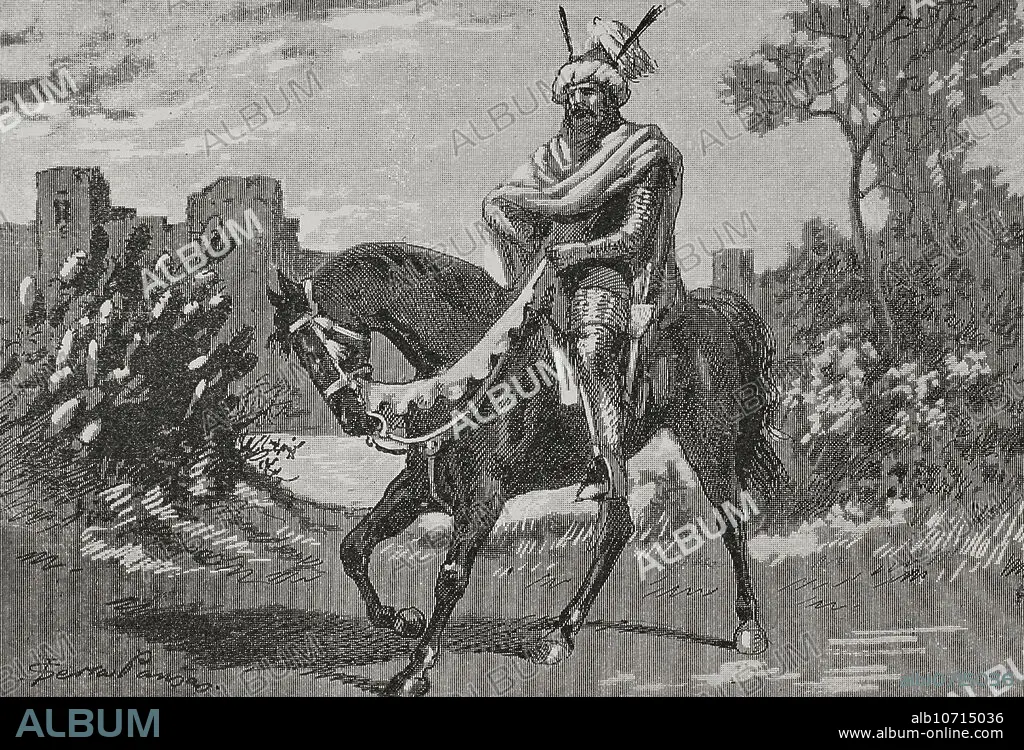 JOAN SERRA PAUSAS (ACTIVE 1861-1902). Almanzor (h. 939-1002). Militar y político andalusí. Canciller del Califato de Córdoba (978-1002). Retrato ecuestre. Grabado por Serra Pausas. "Glorias Españolas". Tomo II. Publicada en Barcelona, 1890.