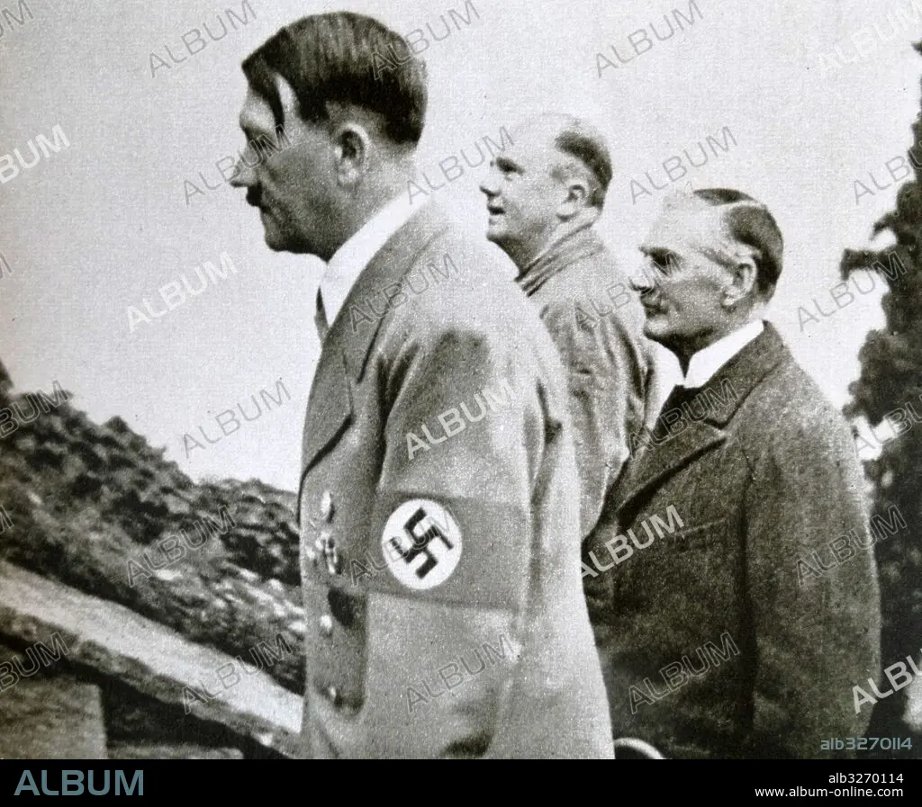 Photographic print of Adolf Hitler (1889-1945) a German politician who was the leader of the Nazi Party, Chancellor of Germany, and Fuhrer of Nazi Germany, Joachim von Ribbentrop (1893-1946) a Foreign Minister of Nazi Germany, and Neville Chamberlain (1869-1940) a British Conservative politician and Prime Minister of the United Kingdom. Dated 20th Century.