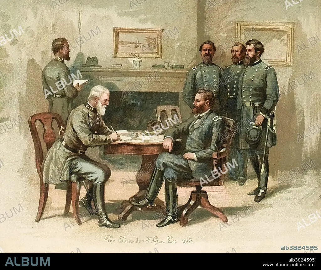 General Ulysses S. Grant accepting the surrender of General Robert E. Lee at Appomattox Court House, 1865. Painted by Thure de Thulstrup (1848 -1930) in 1865. Ulysses S. Grant (1822-1885) was the 18th President of the United States and the leading Union general during the American Civil War (1861-1865). A career soldier, he graduated from the United States Military Academy at West Point and served in the Mexican-American War. Under Grant, the Union Army defeated the Confederate military and effectively ended the Civil War with the surrender of Robert E. Lee's army at Appomattox. Grant served two consecutive terms as President after the war and during the turbulent Reconstruction period that followed.