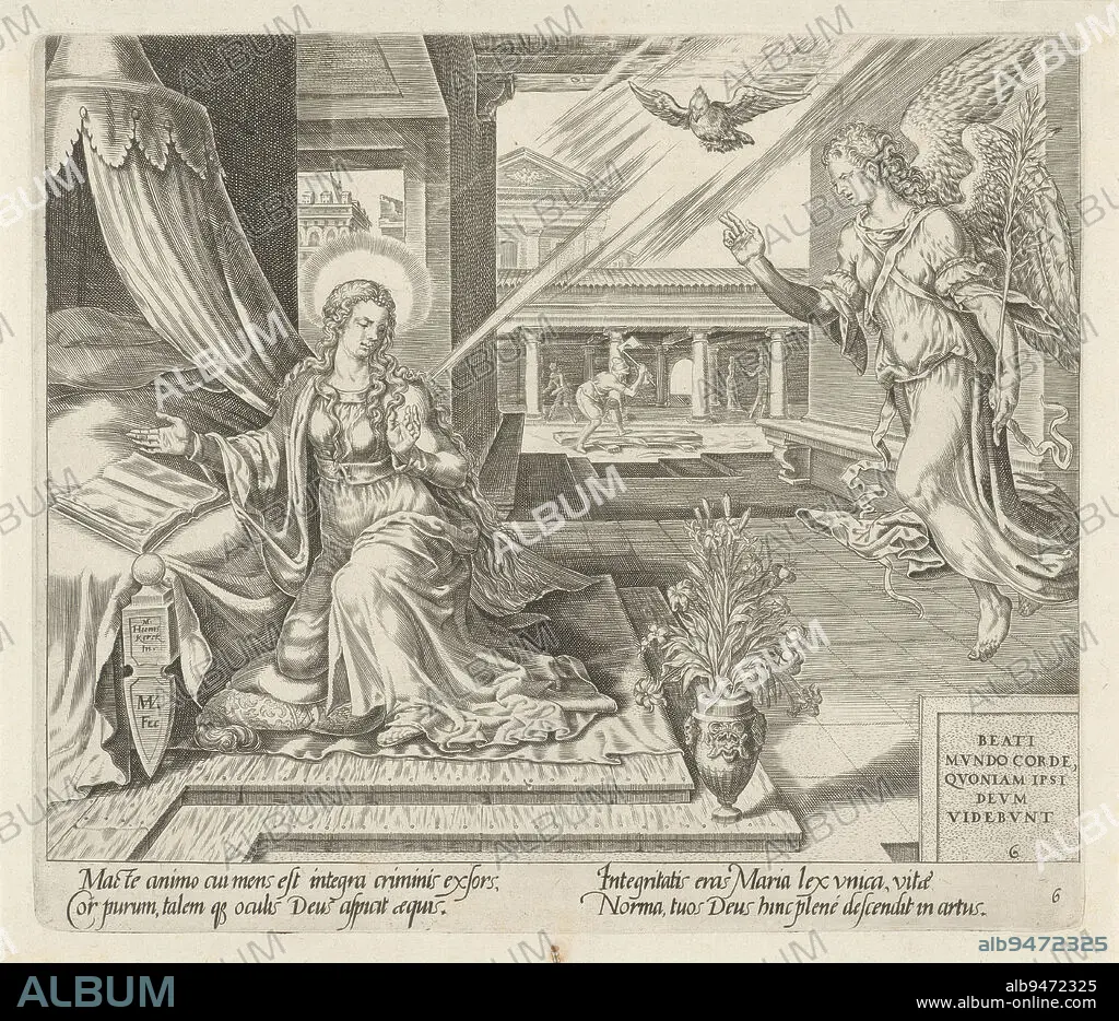 The angel Gabriel announces to Mary that she will become pregnant. Mary is kneeling by a bed, on which lies an open book. The Holy Spirit descends like a dove. In the background, Joseph is chopping wood. Print is part of a series on the eight beatitudes of Christ and illustrates the beatitude: Blessed are those who are pure in heart. In the lower right corner this text from Mat 5:8 in Latin. At the bottom, in the margin, a verse in Latin about the Beatitude and the representation, Annunciation Blessed are those who are pure in heart The eight Beatitudes , print maker: Harmen Jansz Muller, (mentioned on object), Maarten van Heemskerck, (mentioned on object), Hadrianus Junius, print maker: Amsterdam, publisher: Antwerp, 1564 - 1568, paper, engraving, h 213 mm × w 249 mm
