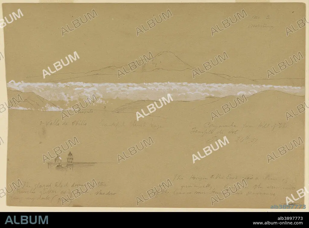 FREDERIC EDWIN CHURCH. Cayambé, Morning, from the Temple of the Sun, Quito. Date/Period: June 24, 1857. Drawing. Graphite, brush and white gouache on tan wove paper.