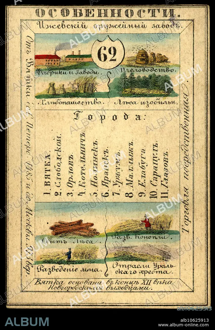 Vyatka Province, 1856. This card is one of a souvenir set of 82 illustrated cards-one for each province of the Russian Empire as it existed in 1856. Each card presents an overview of a particular province's culture, history, economy, and geography. The front of the card depicts such distinguishing features as rivers, mountains, major cities, and chief industries. The back of each card contains a map of the province, the provincial seal, information about the population, and the local costume of the inhabitants. National Library of Russia