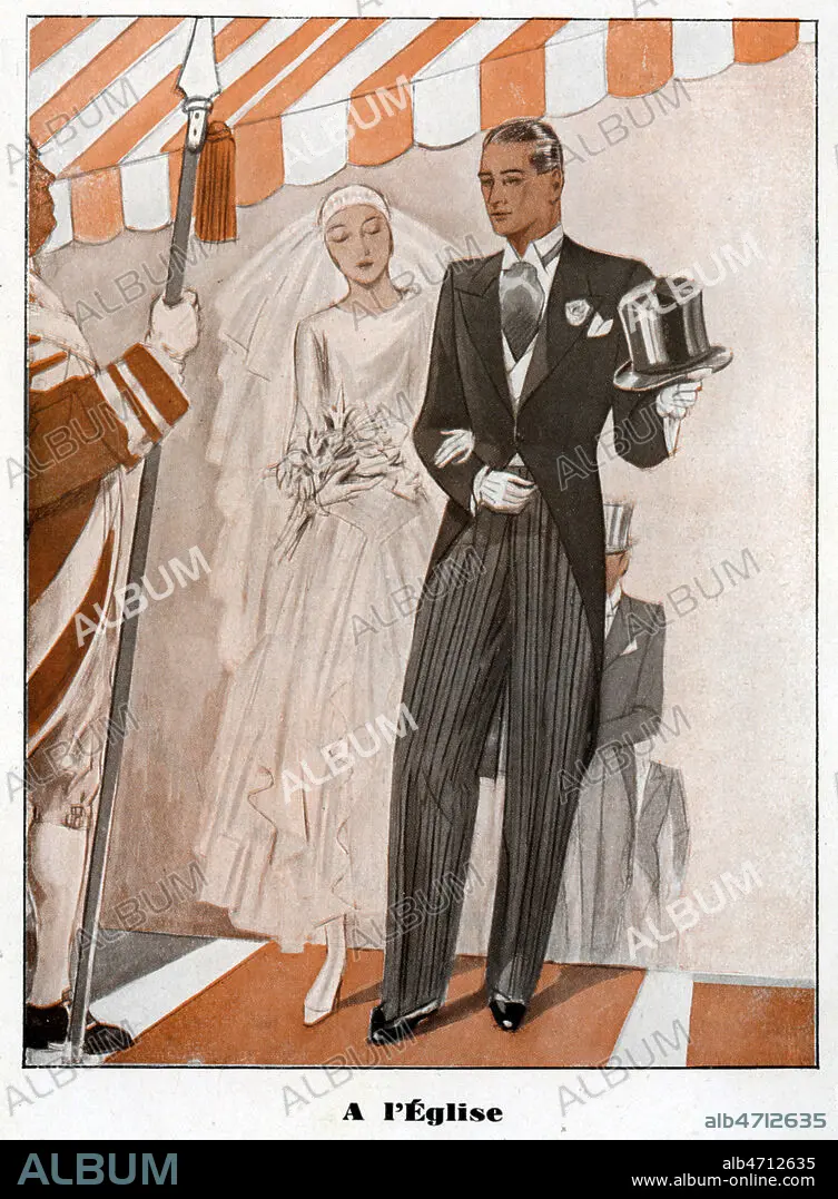 'A la mairie' : scene de mariage. Brochure publicitaire vers 1930 pour le tailleur GUESDON. Illustration anonyme. Credit : Collection IM/KHARBINE-TAPABOR.