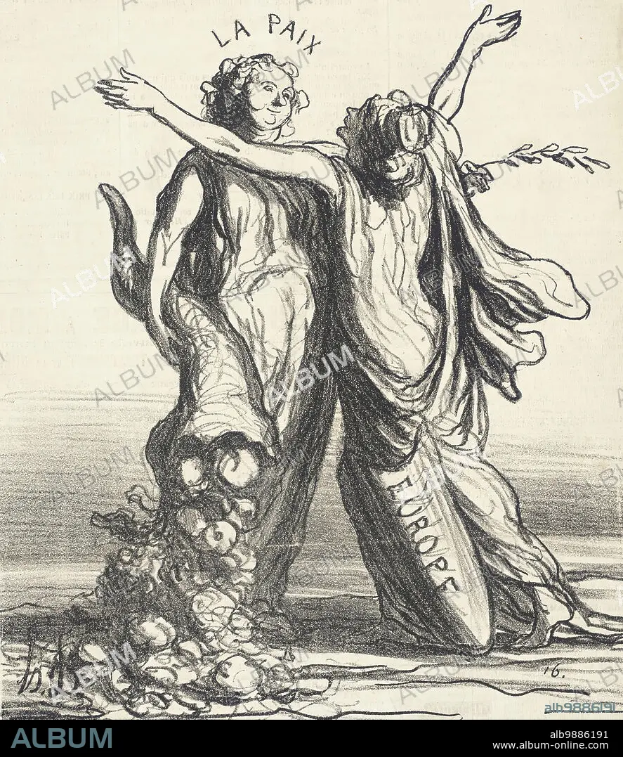 Un Baiser de circonstance, 1867. The allegorical figures of Peace and Europe exchange a kiss. From Actualités.