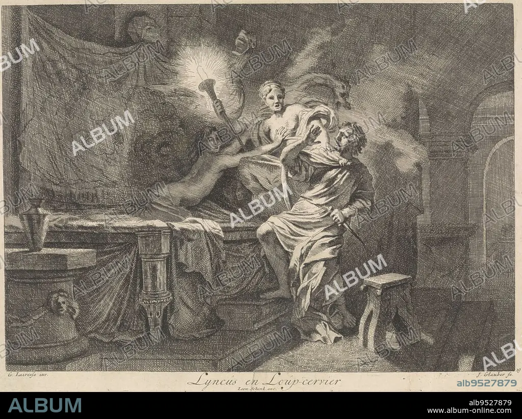 Ceres prevents the murder of Triptolemus, Johannes Glauber, after Gerard de Lairesse, 1656 - 1726, In the night, King Lynkos of Skythia attempts to murder the young Triptolemus in his sleep. Ceres prevents this and then transforms Lynkos into a lynx. In the background the three dragons of Triptolemus. The print is part of a series with Biblical, mythological and allegorical representations., print maker: Johannes Glauber, (mentioned on object), Gerard de Lairesse, (mentioned on object), publisher: Leonard Schenk, (mentioned on object), unknown, 1656 - 1726, paper, etching, w 377 mm × h 280 mm