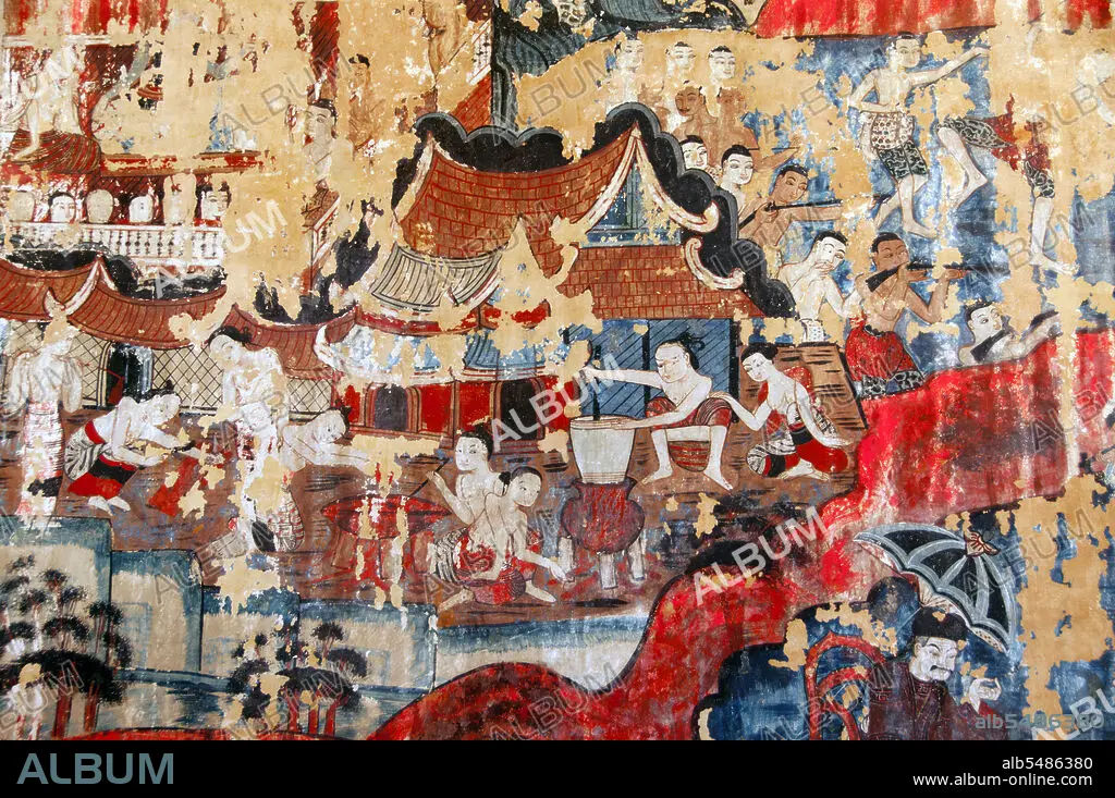 Título: Thailand: A household going about their daily chores, northern wall mural, Wat Buak Khrok Luang, Chiang Mai