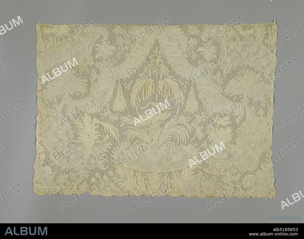 Cravat end, Medium: linen Technique: bobbin lace, Brussels style, Fine lace cravat end depicting Cupid with a bow and arrow standing in a fountain in which swans are swimming; surrounded by an elaborate framing of swags and tassels, exotic foliage and birds., Belgium, mid-18th century, lace, Cravat end
