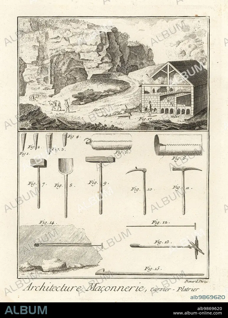 Quarrymen plasterers and their tools, 18th century. Workers at a plaster stone quarry, with axe, shovel, hammer, pick, etc. Architecture: Maconnerie, carrier-platrier. Copperplate engraving by Robert Benard from Denis Diderot and Jean le Rond dAlemberts Encyclopedie (Encyclopedia), Geneva, 1778.