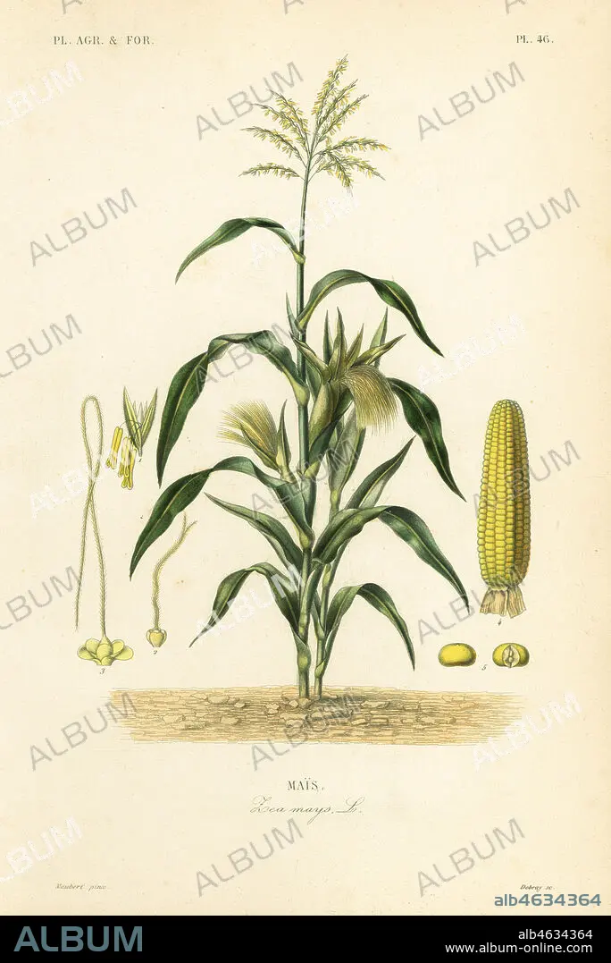 Maize or corn, Zea mays, Mais. Handcoloured steel engraving by Debray after a botanical illustration by Edouard Maubert from Pierre Oscar Reveil, A. Dupuis, Fr. Gerard and Francois Herincqs La Regne Vegetal: Planets Agricoles et Forestieres, L. Guerin, Paris, 1864-1871.