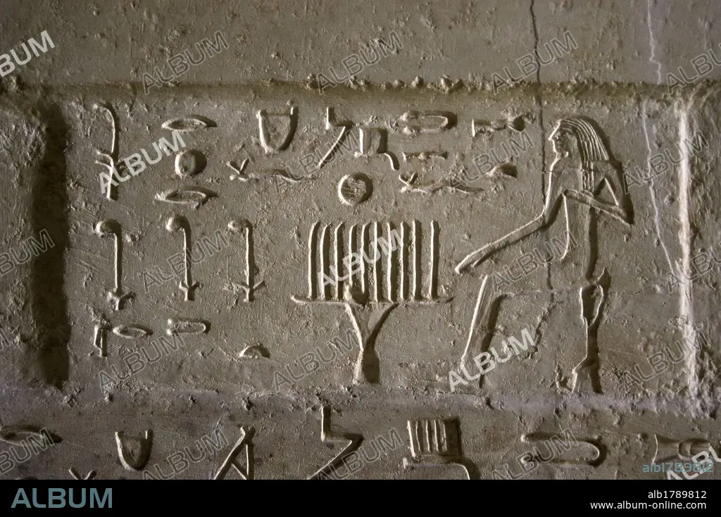ESCRITURA JEROGLICIA. NUMERACION EGIPCIA. TUMBA DE NEFER Y KA-HAY. Perteneciente a la V Dinastía. Relieve jeroglífico con la representación de difunto junto a la mesa de ofrendas. Se menciona la cantidad concreta de alimentos ofrendados, utilizando un sistema de numeración basado en base 10 para los números, con símbolos diferentes para la unidad, decenas y el millar. IMPERIO ANTIGUO. NECROPOLIS DE SAKKARA. Egipto.