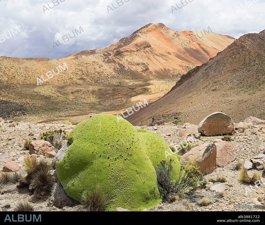 Yareta or Llareta cushion plant (Azorella compacta), Putre, Arica and Parinacota Region, Chile, South America.