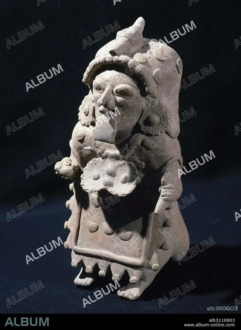 PERIODO PRECOLOMBINO-PREINCAICO. CULTURA JAMA-COAQUE (500 a. C. -500 d. C.). Localizada entre el cabo San Francisco y la actual Bahía de Caráguez. FIGURA DEL TIPO CHONE. Piezas vacías, realizadas a molde y a mano, con una decoración en cabeza y vestidos, llevando generalmente objetos rituales en las manos. FIGURA MASCULINA, 37 x 20 cm. Procede del Ecuador. Colección particular.