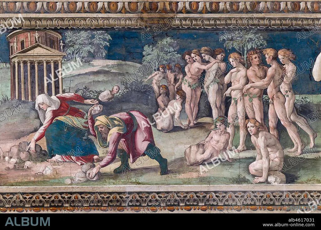 Rome, Villa Farnesina, The Hall of Perspectives: the ample frieze with mythological scenes inspired by the Ovid Metamorphoses. Detail of Deucalion and Pyrrha throwing stones.. Frescoes by Baldassarre Peruzzi (1517-8). Once the deluge was over and the couple had given thanks to Zeus, Deucalion (said in several of the sources to have been aged 82 at the time) consulted an oracle of Themis about how to repopulate the earth. He was told to cover his head and throw the bones of your mother behind your shoulder. Deucalion and Pyrrha understood that "mother" is Gaia, the mother of all living things, and the "bones" to be rocks. They threw the rocks behind their shoulders and the stones formed people. Pyrrha's became women; Deucalion's became men.