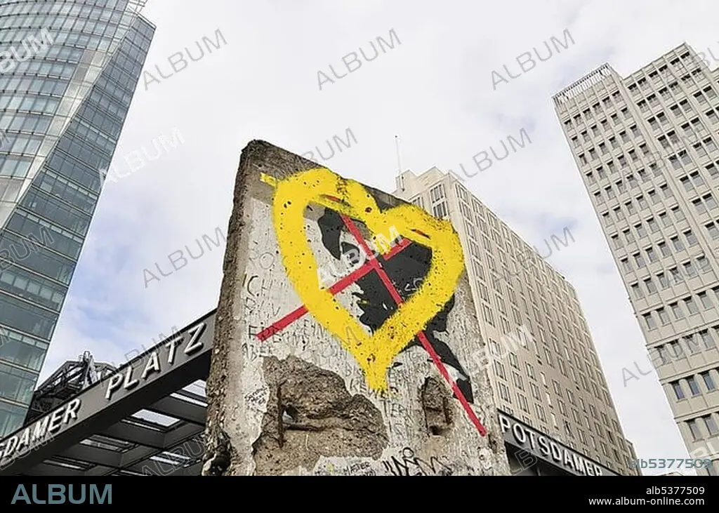 Remains of Berlin Wall at Potsdamer Platz, Potsdam Square, BahnTower on the left, Beisheim Centre on the right, Berlin, Germany, Europe.
