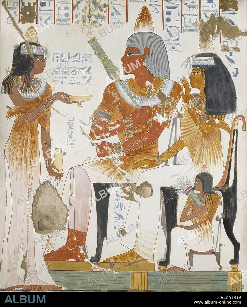 Copy of wall painting, private tomb 181 of Nebamun and Ipuky, Thebes, deceased, mother and daughter offered wine by lady, 20th century. Framed.