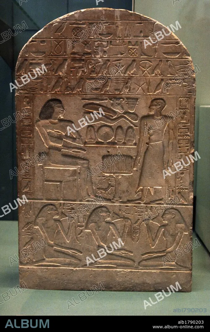 ARTE EGIPCIO. IMPERIO MEDIO. DINASTIA XII. ESTELA DE USER. Realizada en piedra caliza y decorada con inscripciones jeroglíficas relativas a la petición de ofrendas para el Ka de User. La escena central representa al DIFUNTO ACOMPAÑADO POR SU PERRO Y SENTADO ANTE LA MESA DE OFRENDAS. Fechada entre los años 1985-1795 a. C., de procedencia desconocida. Museo Británico. Londres. Inglaterra. Reino Unido.