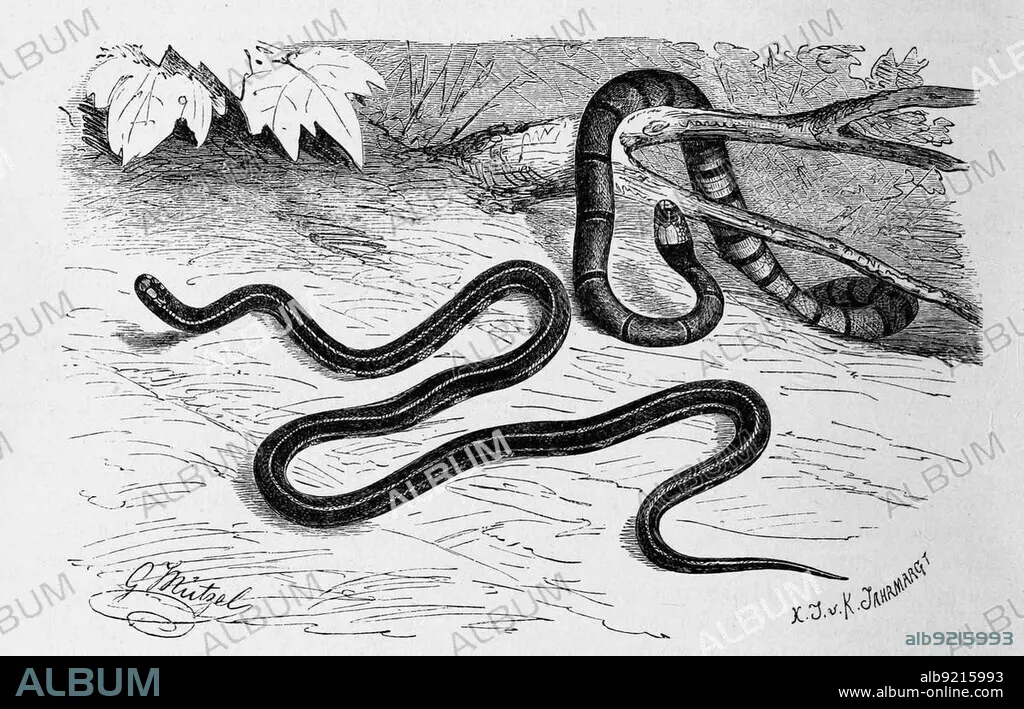 Reptiles, Blue belly adder, Blue coral snake, Calliophis bivirgata, syn. Maticora bivirgatus is a venomous species of snake in elapid snake (Elapidae) and Masked adder, Callophis Maccellandii, Elaps Maccellandii, Historic, digitally restored reproduction from a 19th century original