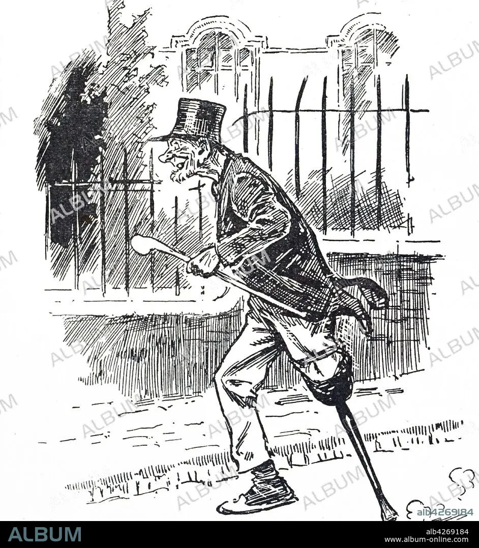 Engraving depicting an elderly man walking with a wooden leg through the streets of London. Dated 19th century