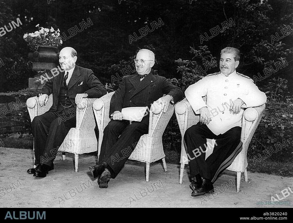 Potsdam Conference. Clement Attlee, Harry Truman, and Joseph Stalin, seated outdoors, August 1, 1945. The Potsdam Conference was held at the home of Crown Prince Wilhelm Hohenzollern, in occupied Germany, from July 17 to August 2, 1945. Participants were the Soviet Union, the United Kingdom and the United States. The three powers were represented by Communist Party General Secretary Joseph Stalin, Prime Ministers Winston Churchill, Clement Attlee, and President Harry S. Truman. Stalin, Churchill, and Truman, as well as Attlee, who participated alongside Churchill while awaiting the outcome of the 1945 general election, and then replaced Churchill as Prime Minister after the Labour Party's defeat of the Conservatives, gathered to decide how to administer punishment to the defeated Nazi Germany, which had agreed to unconditional surrender nine weeks earlier, on May 8 (V-E Day). The goals of the conference also included the establishment of post-war order, peace treaties issues, and countering the effects of the war.