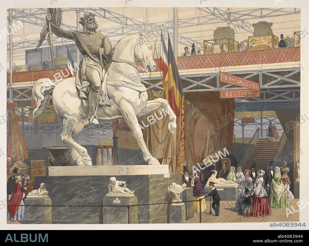 JOHN ABSOLON. View in the East Nave. Godfrey of Bouillon, by Simonis'. The centrepiece of the Belgian display was a statue of the medieval hero Godfrey of Bouillon by Eugène Simonis. Recollections of the Great Exhibition, 1851. London : Lloyd Bros, 1851. "From drawings ... by Messrs. Absolon, Goodall, Pidgeon, T. Wilson, and others". Colour illustration: 60 cm. . Source: X 953 plate 17.