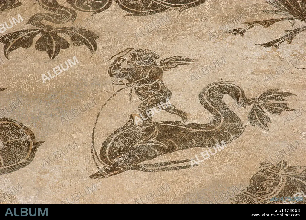 ARTE ROMANO. ITALIA. OSTIA ANTICA. Ciudad romana en la costa del mar Tirreno y antiguo puerto comercial de la Roma Imperial. TERMAS DE NEPTUNO. Fechadas entre el siglo I-II d. C. Detalle del MOSAICO del "TRIUNFO DE NEPTUNO". AMORCILLO CABALGANDO ENCIMA DE UN DELFIN. Alrededores de Roma.