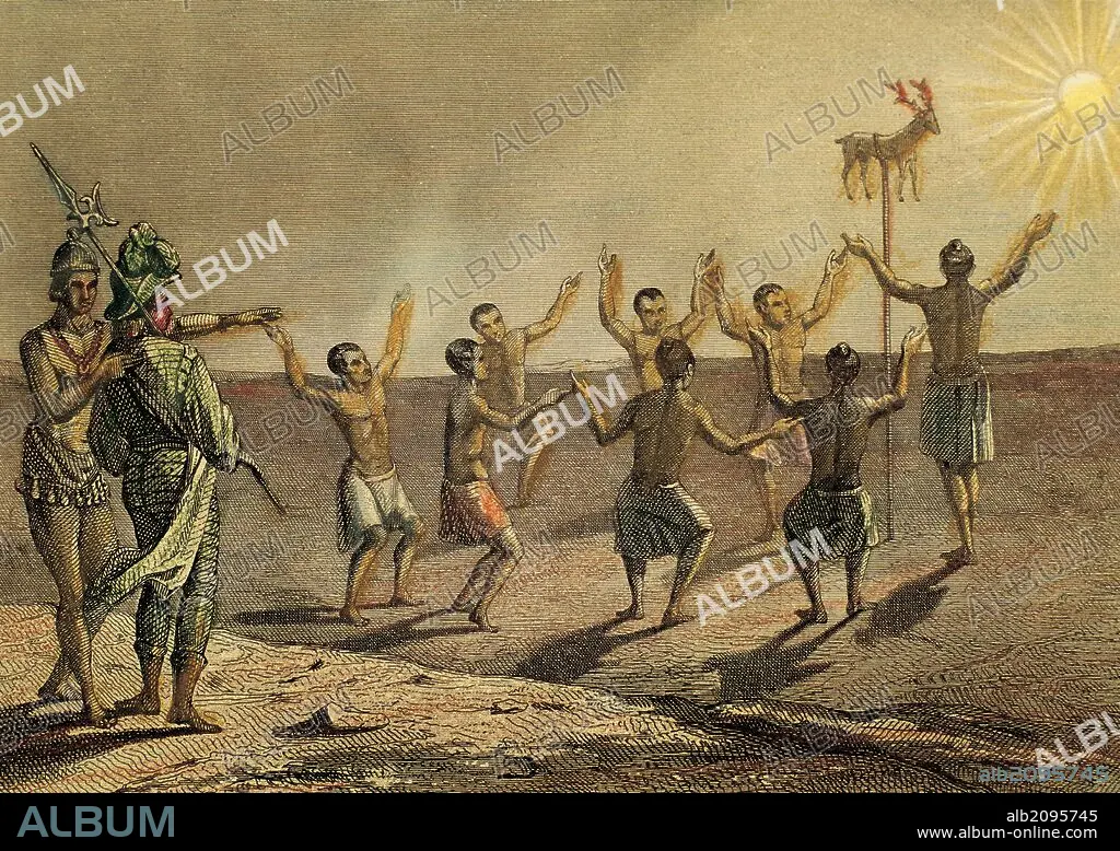 Descripción: EVANGELIZACION DE AMERICA. FLORIDA. En el año 1569 el sol parecía la única divinidad venerada para los habitantes de esta región, celebrando anualmente el mismo ritual. "INDIGENAS ADORANDO AL SOL COLOCANDO EN UN POSTE LA PIEL DE UN CIERVO PARA SACRIFICARLO AL ASTRO REY". Grabado del año 1850.