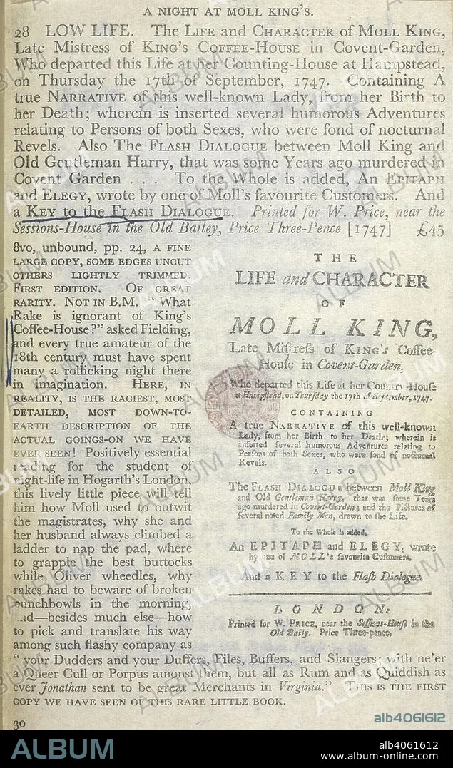 Frontispiece of 'The Life and Character of Moll King'. The Life and Character of Moll King, late mistress of King's Coffee-House in Covent-Garden ... Containing a true narrative of this well-known lady, from her birth to her death ... London : W. Price, [1747]. Source: C.133.dd.7, frontispiece. Language: English.