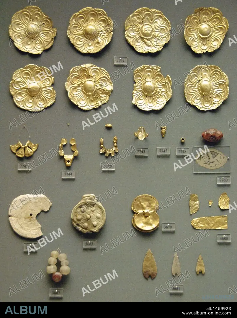 ARTE MICENICO. Conjunto de diferentes piezas de oro entre las que destacan ocho ROSETAS CON PETALOS. Koukaki, Atenas. Datadas en el s. XIV a. C. Museo Arqueológico Nacional. Atenas. Grecia.