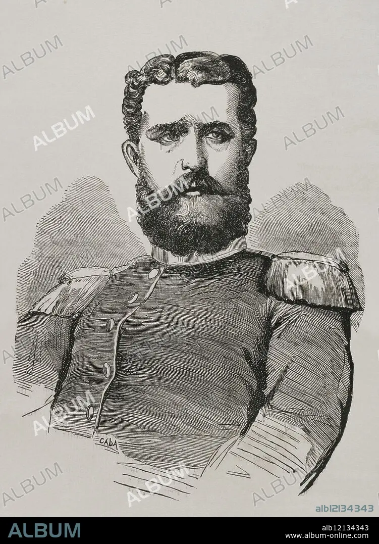 Descripción: Leopoldo de Hohenzollern-Sigmaringen (1835-1905), príncipe de Hohenzollern. Noble, político y militar prusiano de la casa de Hohenzollern. Tras el derrocamiento en 1868 de la reina Isabel II de España (1830-1904), el general Juan Prim propuso en 1870 al príncipe de Hohenzollern para el trono español. Retrato. Grabado por Caba. "Historia de la Guerra de Francia y Prusia". Tomo I. Publicado en Barcelona, 1870.