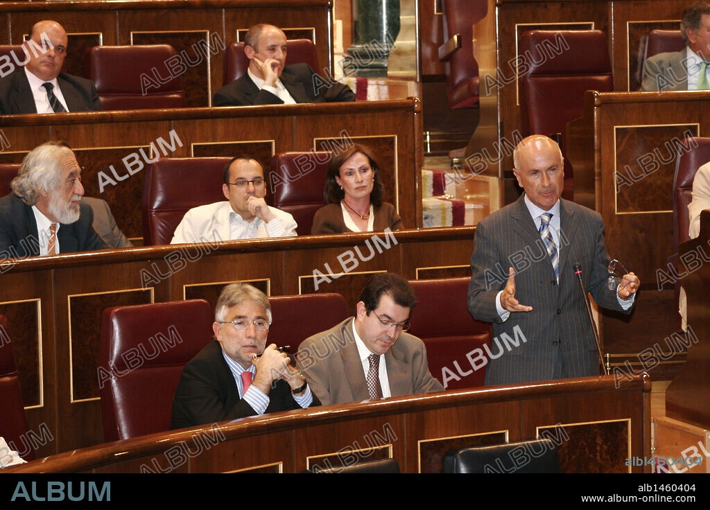 JOSEP ANTONI DURAN I LLEIDA (1952). Político catalán, perteneciente al partido nacionalista CiU (Convergència i Unió). Portavoz de su partido en el Congreso (desde 2004-actualidad) Intervención en el hemiciclo. Madrid, 2005. España. En la izquierda de la imagen, JOSEP SANCHEZ LLIBRE, miembro del mismo partido.