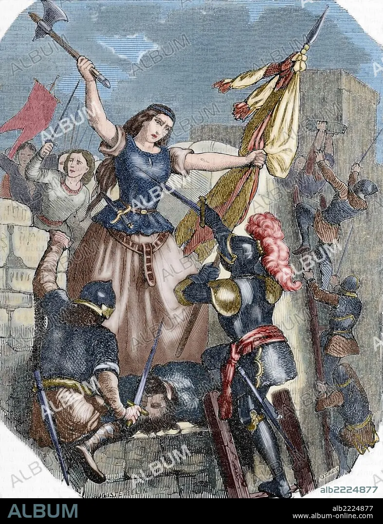 Jeanne Laisné (n.1456). Heroína francesa apodada Jeanne Hachette, figura emblemática de la resistencia francesa contra Carlos el Temerario. Jeanne Hachette durante el sitio de Beauvais, 27 de junio de 1472. Grabado por Pothey. " Biblioteca Universal Ediciones Populares", 1851. Coloreado.
