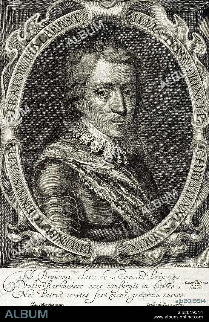 CRISTIAN DE BRUNSWICK, o Christian, Duque de Brunswick-Lüneburg (1599-1626). Obispo luterano de Halberstadt. Líder militar Alemán durante la Guerra de los Treinta Años, en donde se ganó la reputación de fanático Religioso. Grabado.