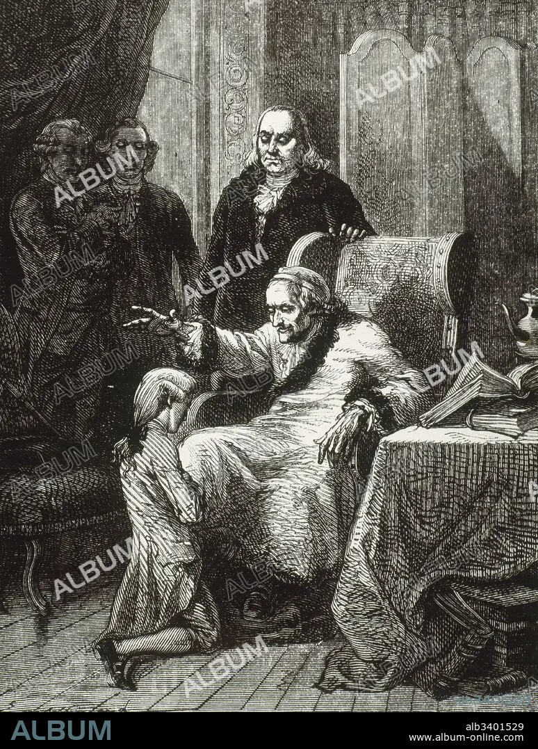 Voltaire (François Marie Arouet) (París, 1694-París, 1778). Escritor francés. Voltaire bendiciendo al nieto de Franklin. Grabado.