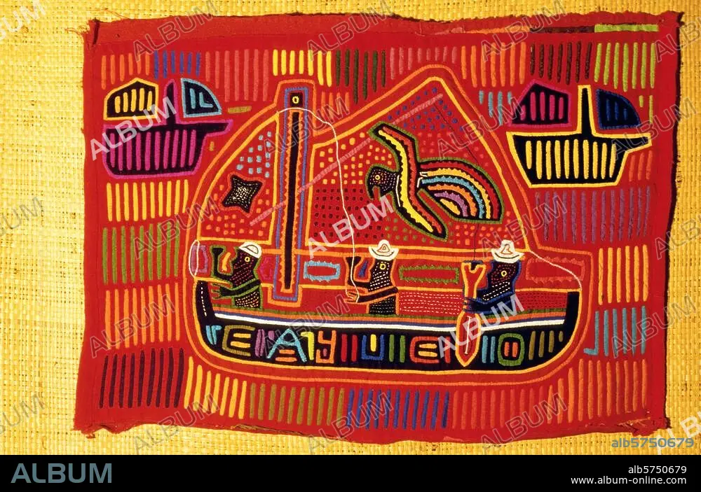Ethnologie : indiens Kuna, "Kuna Yala" (pays Kuna), San Blas, Panama, 2e moitié du 20e siècle. Mola (corsage portant des motifs sur l'avant et l'arrière, réalisés à partir de tissus de couleurs différentes) : mola de la pirogue. (D'une série de Molakana avec représentations de la vie des Kuna). Coll. privée.