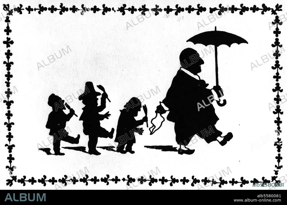 Bruckner, Anton Komponist Ansfelden 4.9.1824 - Wien 11.10.1896. "Bruckner und die Bösen Buben". (Hanslick, Kalbeck und Heuberger). Zeichnung in Scherenschnittmanier von Otto Böhler.