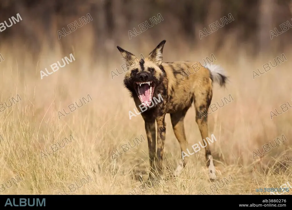 African Wild Dog (Lycaon pictus), yawning, endangered species, captive, Harnas Wildlife Foundation, Namibia, Africa